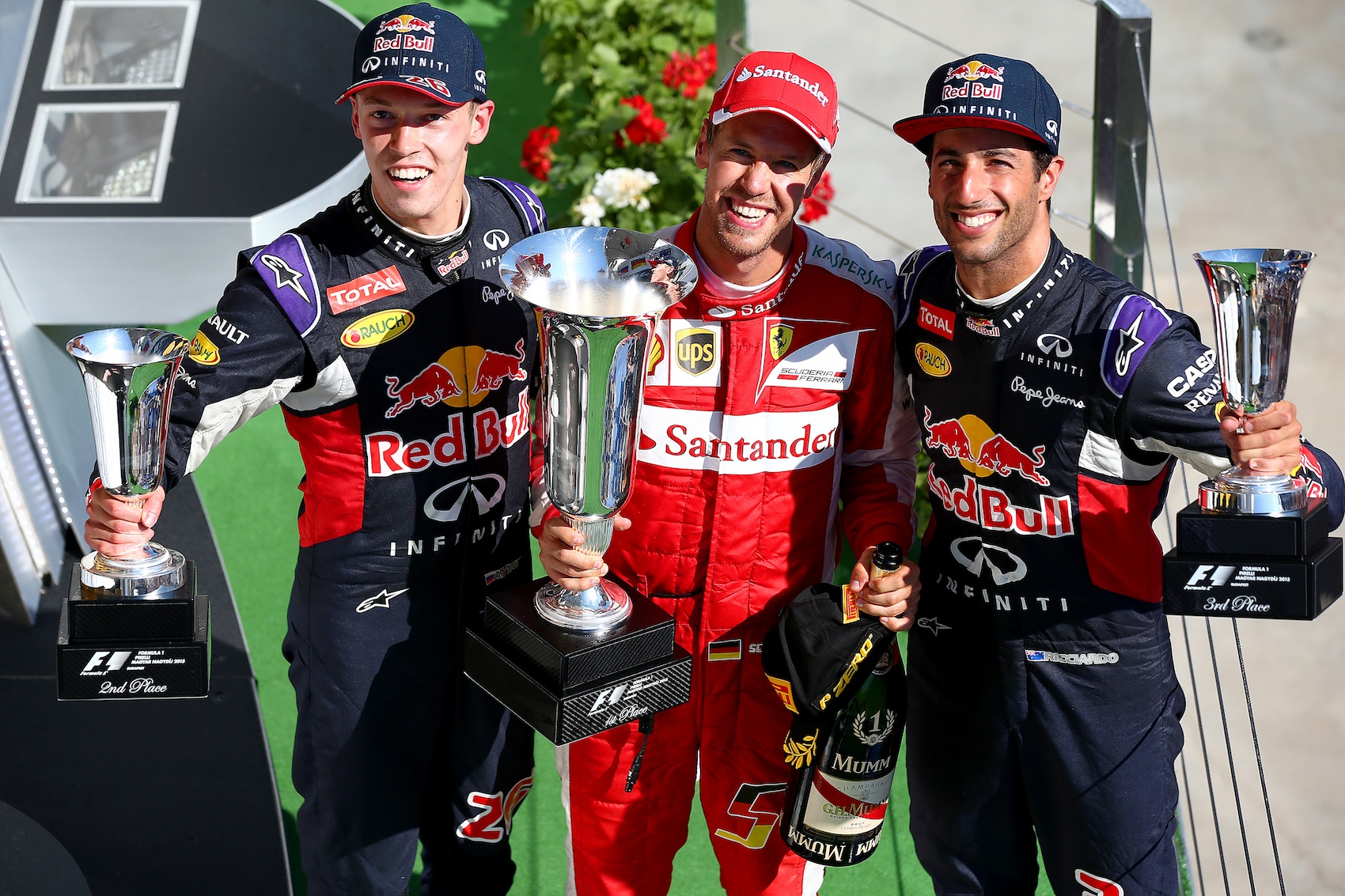 Budapest 2015 Sieger Sebastian Vettel mit Daniel Ricciardo und Daniil Kvyat (c) Thompson Getty Images