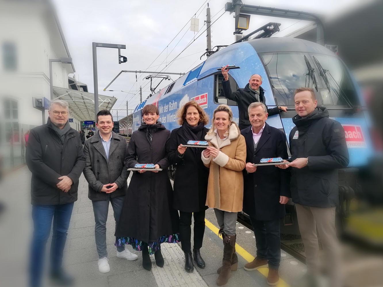 Mit etwas Verspätung fuhr sie dann am Bahnsteig 1 des Salzburger Hauptbahnhofes ein: Eine Lok der ÖBB, die anlässlich der FIS Alpine Skiweltmeisterschaften Saalbach 2025 im WM-Design gebrandet wurde. Dabei durfte natürlich die Zugtaufe mit dem obligaten Flasche-auf-den-Zug-klatschen nicht fehlen. Die Ehre dazu wurde Alexandra Meissnitzer, ihres Zeichens Doppel-Weltmeisterin, Gesamt-Weltcupsiegerin und saalbach2025-Botschafterin, zu Teil