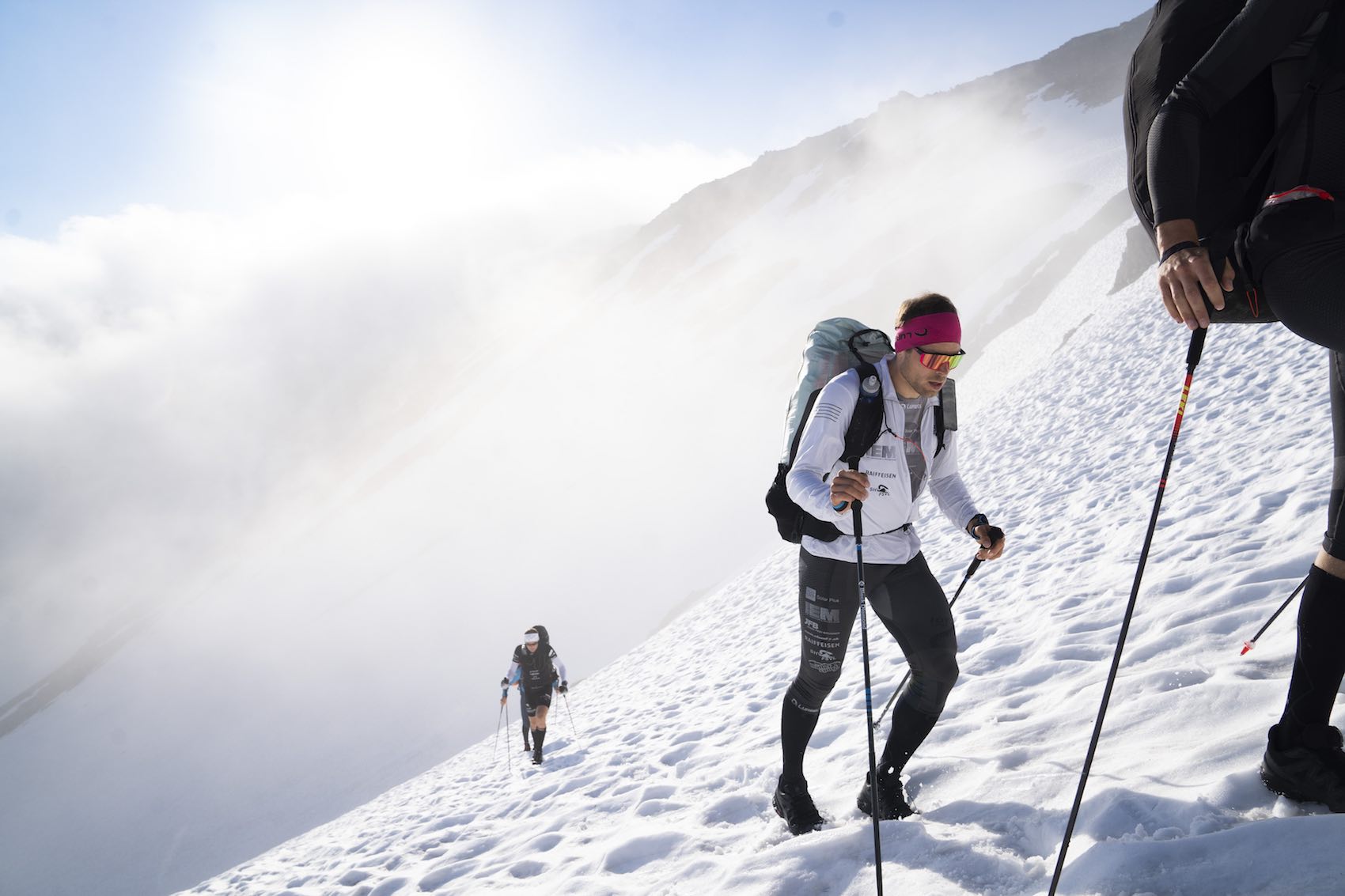 Dazu gehören die französischen Athleten Maxime Pinot (FRA1) und Benoît Outters (FRA2) sowie Simon Oberrauner (AUT2) und Patrick von Känel (SUI2), die nur 20 km voneinander getrennt waren, als sie am Nachmittag Turnpoint 10, Piz Palü, erreichten. Vor allem der Steirer Simon Oberrauner zeigt sich in sehr guter Form, und mischt nach wie vor im Kampf um die Podiumsplätze mit.