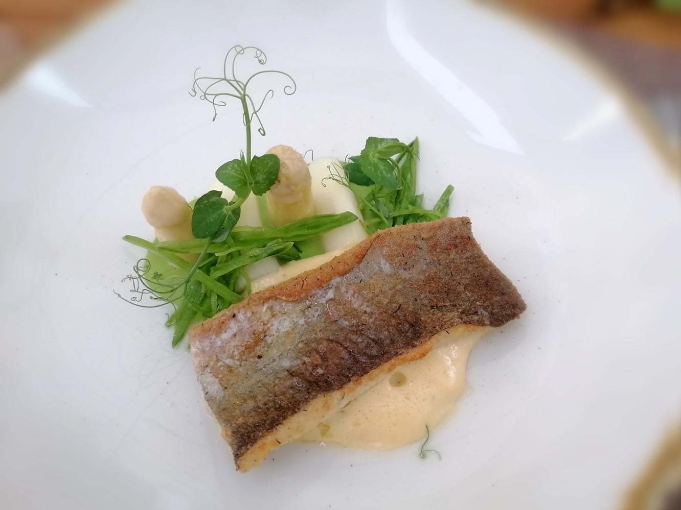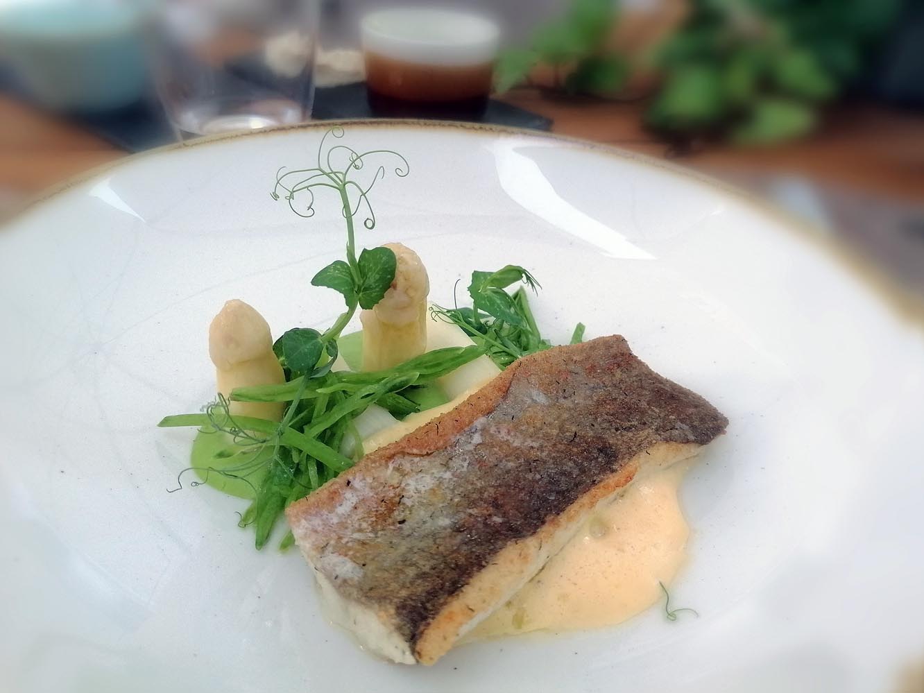 Mit Spargel, Hollandaise und Erbsenpüree kommt der ebenfalls von der Fischerei Grüll stammende Saibling, der wunderbar mit dem komplexen 2022 Riesling Smaragd vom Ried Kirnberg mit seinen Noten von gelbem Steinobst und gut eingebundener Säure harmoniert. Saibling zählt zu den Lieblingsfischen des Küchenchefs: „Ich würde ihm gegenüber Lachs oder Thunfisch immer den Vorzug geben. Die letzten überlebenden Exemplare sollten wir wirklich im Meer lassen.“