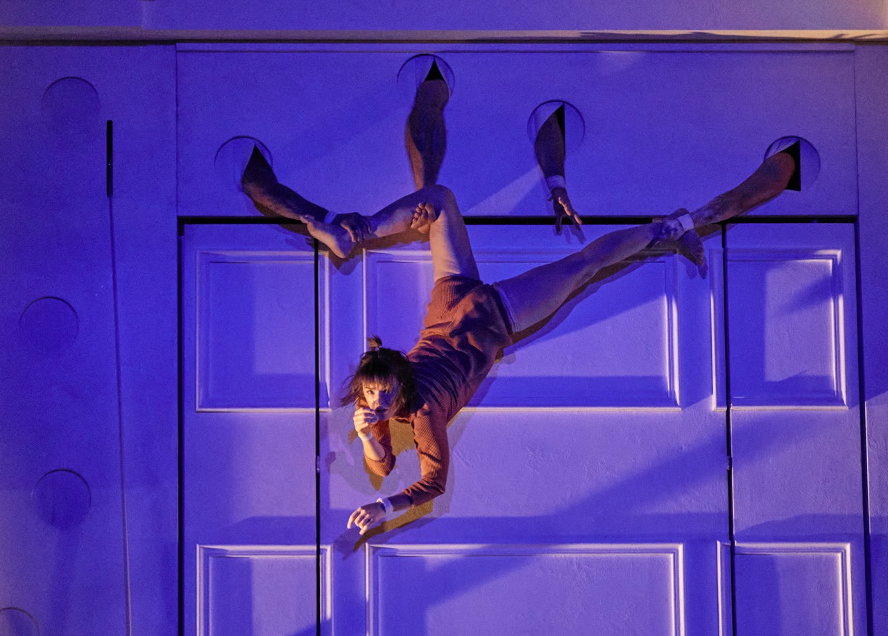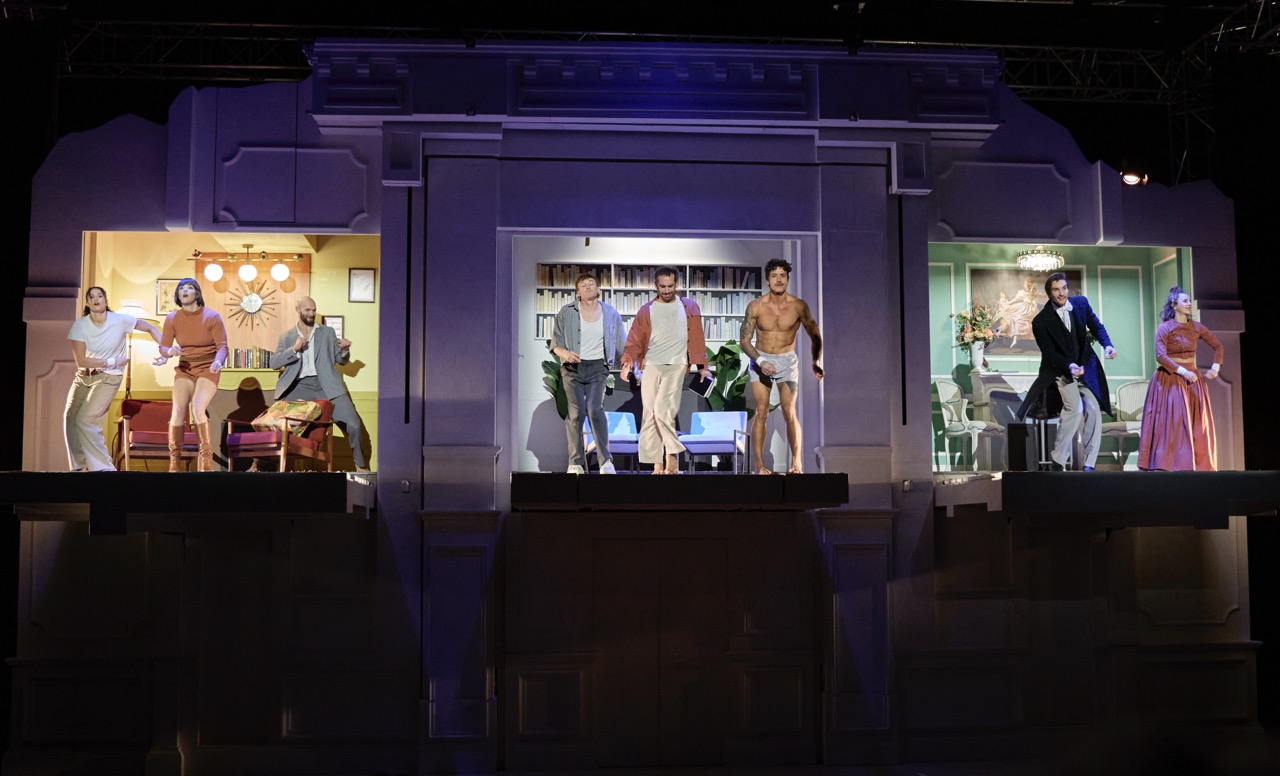 „Entre Chiens et Louves“ (Zwischen Hunden und Wölfen) enthüllt die Geschichten dreier Menschen, die in unterschiedlichen Epochen leben: 1870, 1960 und 2022. Der Hauptdarsteller Alex, aus dem Jahr 2022, taucht immer wieder in die Welten der Anderen ein und die Grenzen zwischen Realität und und Fiktion verschwimmen. Zu Beginn öffnen sich in der beeindruckenden Bühnenkulisse drei Wohnräume, aus den unterschiedlichen Epochen.