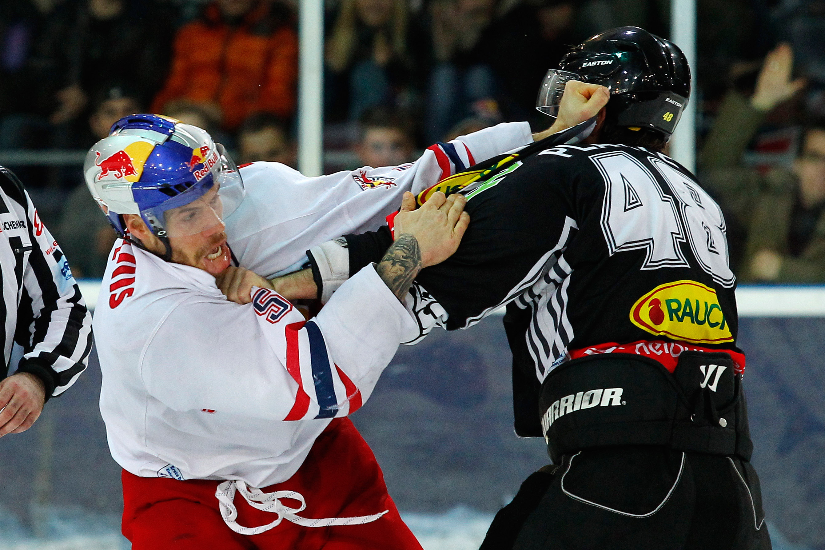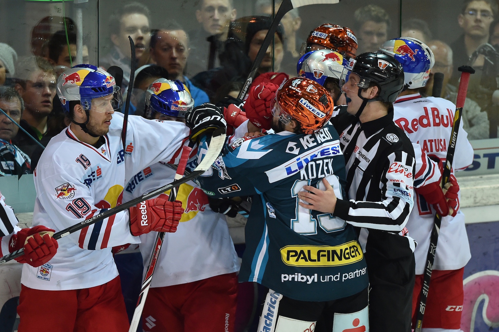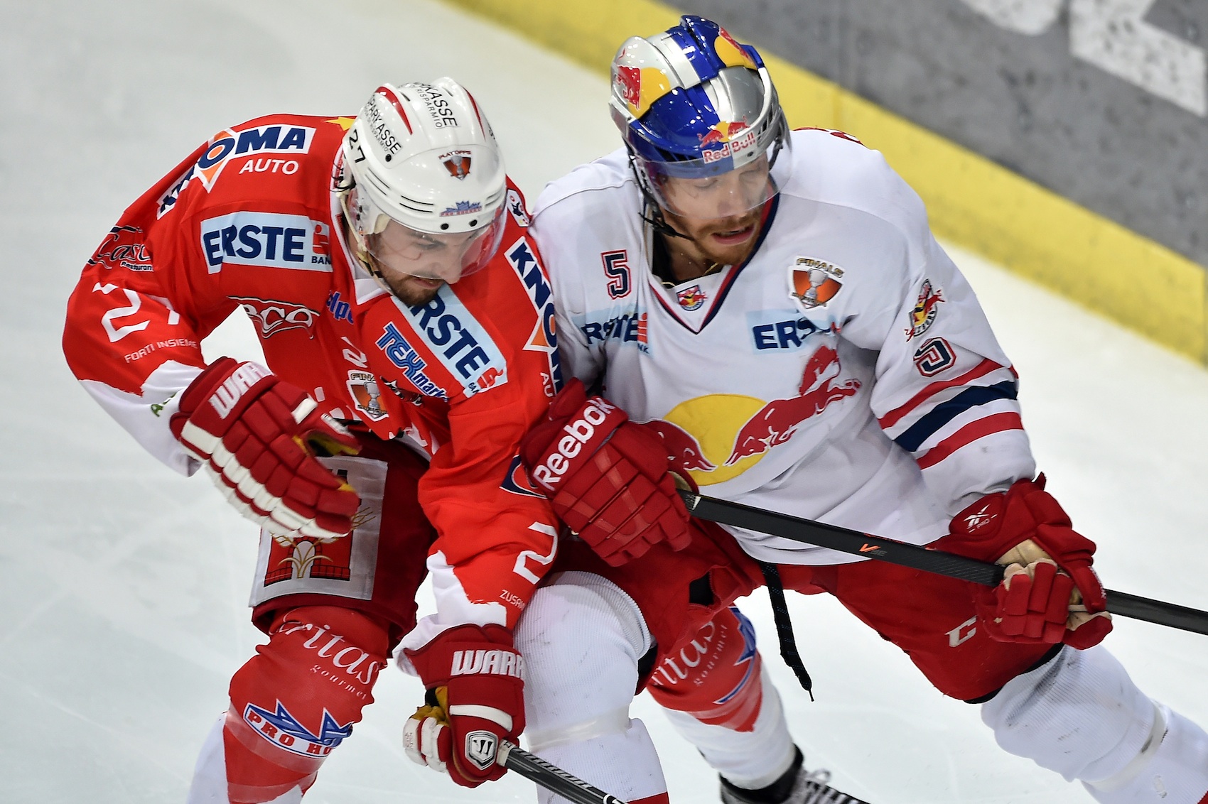 Zu Beginn des dritten Durchgangs drehten die Hausherren weiter auf und kamen nicht unverdient zu ihrem ersten Tor, Marco Pewal stocherte die Scheibe im Powerplay über die Linie. Danach musste auch Brian Fahey wegen Crosschecks mit 5min+ Spieldau- erstrafe frühzeitig aus dem Spiel und dann wurde es richtig heiß in Villach. Beide Teams hatten zeitweise 5:3-Über- bzw. Unterzahlspiele – die Red Bulls agierten u.a. zwei Minuten durchgehend in dieser doppelten Unterzahl – und Villachs Druck wurde immer größer. In der 57. Minute war es erneut Marco Pewal, der seinem Team den 2:3- Anschlusstreffer bescherte.
