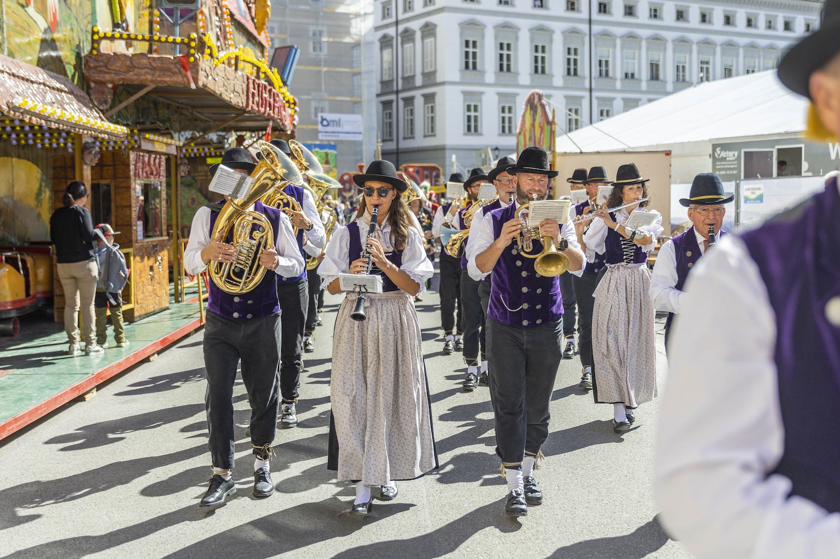 Am Mittwoch, 20. September, um 12 Uhr - wie es die Tradition vorsieht - pünktlich zum Angelusläuten der Domglocken und den anschließenden Salutschüssen der Salzburger Bürgergarde war es soweit: Die feierliche Eröffnung des 46. Salzburger Rupertikirtags ging bei bestem Spätsommerwetter am Domplatz über die Bühne. Zuvor waren die Trachtenmusikkapelle Maxglan, die Bindertanzgruppe Salzburg, die Salzburger Bürgergarde und die Stiegl-Bierkutsche beim gemeinsamen Festzug am Domplatz eingezogen. Nach den Eröffnungsreden erfolgten das Aufziehen der Marktfahne in Vertretung des Hanswursts durch seinen Sohn Rupert Johannes Franz, Mitglied der Bindertanzgruppe, sowie der traditionelle Stiegl-Bieranstich. Dechant für das Dekanat Salzburg Zentralraum Mag. Alois Rupert Dürlinger segnete das „Rupertibrot“ und den „Rupertiwein“, der erstmalig bei der Eröffnung ausgeschenkt wurde. Im Anschluss unternahm die Eröffnungsdelegation einen Rundgang zu den Aussteller:innen des Salzburger Rupertikirtags. Am Alten Markt gaben die Handwerksstände spannende Einblicke in die lokale Kunsthandwerksszene. Zum Abschluss genossen die Festgäste im großen Festzelt am Kapitelplatz die Pongauer Gastlichkeit der Gastwirtevereinigung Großarltal. Neben den Klassikern wie Hendl und Bier wurden auch regionale und saisonale Spezialitäten serviert.
